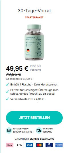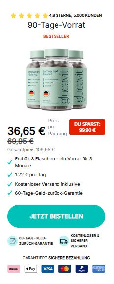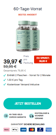 Um sicherzugehen, dass Sie das originale Glucavit erhalten, sollten Sie ausschließlich über die offizielle Website bestellen. Dort profitieren Sie von aktuellen Rabatten, sicheren Zahlungsmethoden und einer Geld-zurück-Garantie.